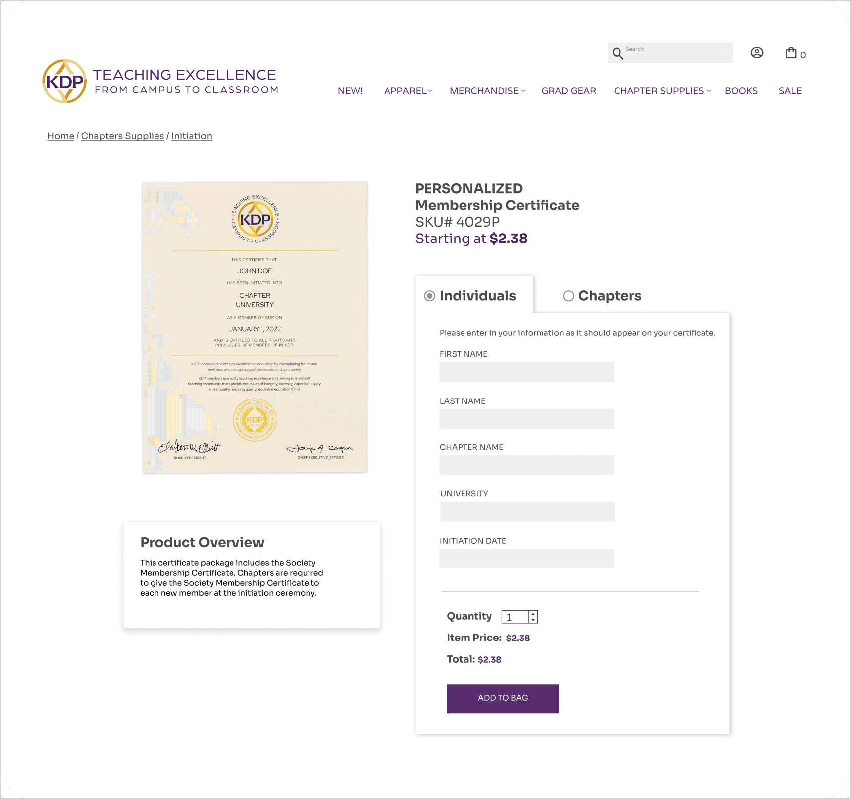 The personalized certificate page required members to email their personalization details separately, with instructions buried in the product description that most users never read. The redesign introduced an individual versus chapter toggle that showed only the fields relevant to the order type. Individual buyers saw five text fields for their personalization data. Chapter buyers saw a file upload option for their spreadsheet along with a quantity discount chart that was previously hidden behind a tab. The price display was changed to show starting at to clearly communicate that quantity-based pricing was available, and the product overview was moved out of the way of the order entry area to reduce visual competition.