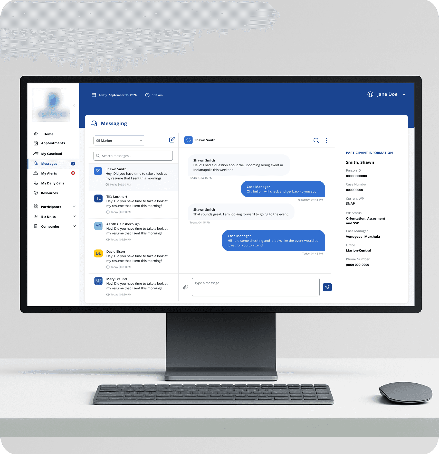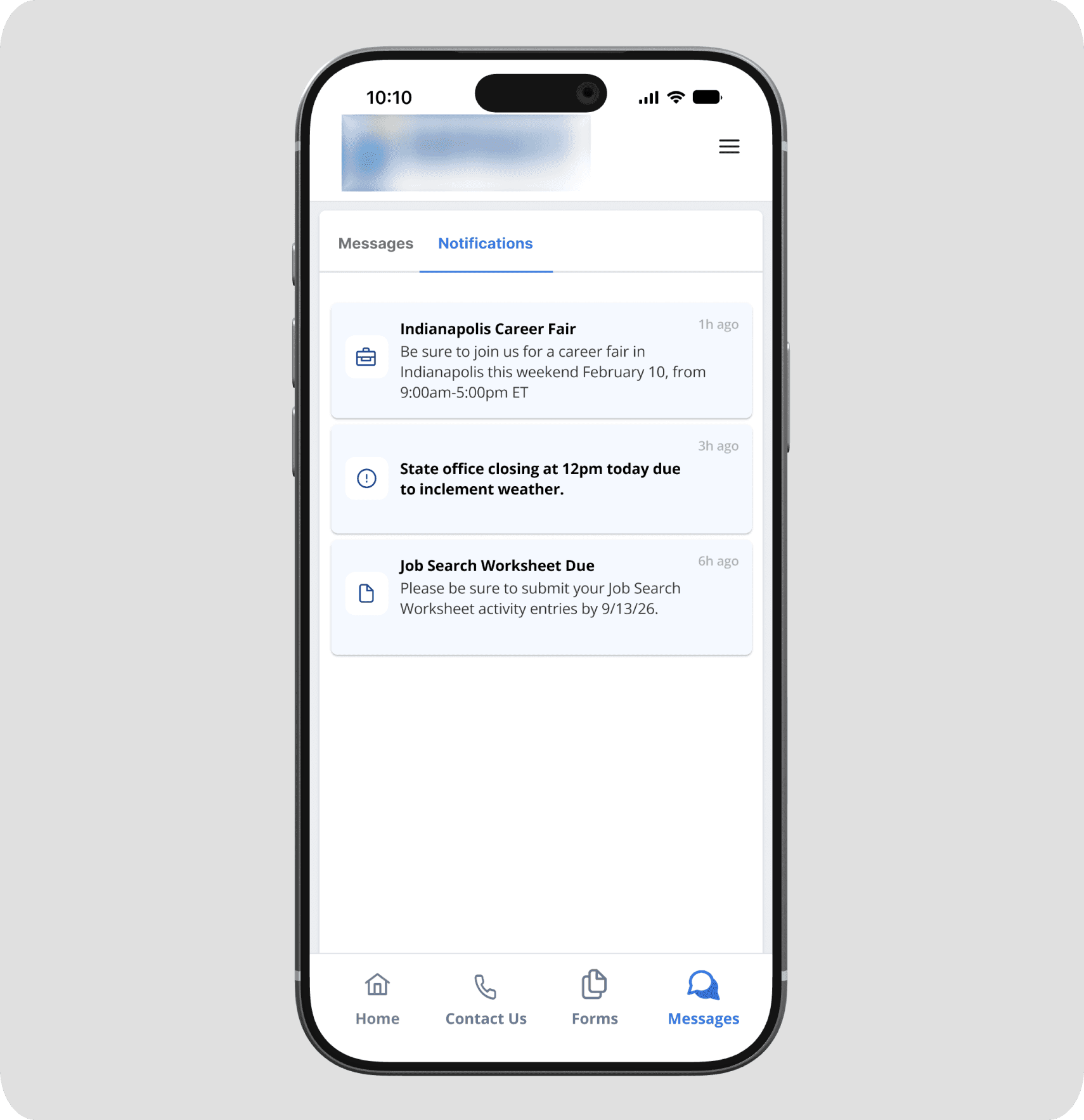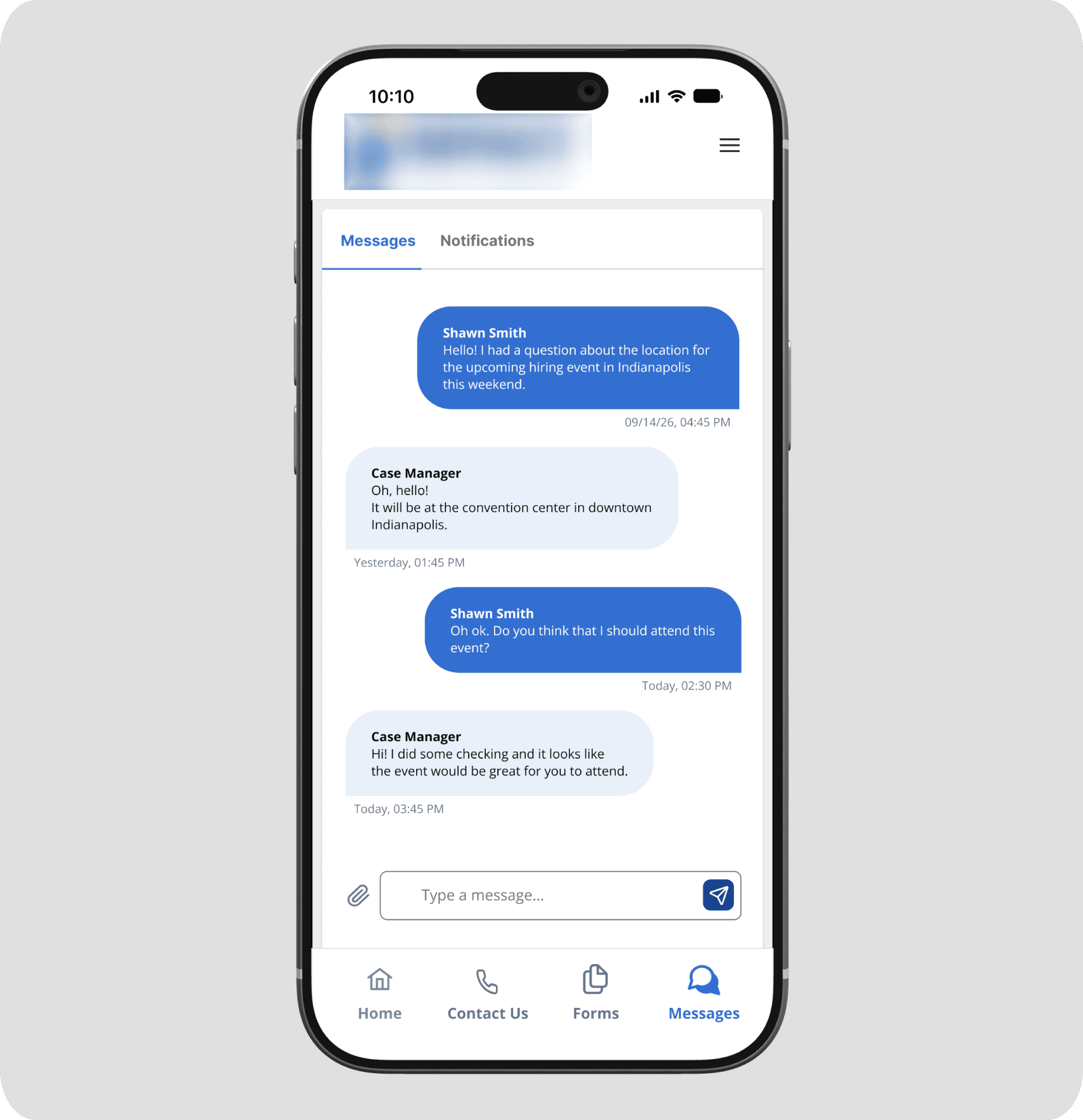 Participants receive push notifications when a new message arrives, surfacing the app even when it is not open. Inside the app, a tabbed Messages section separates direct messages from program notifications like office closures, career event reminders, and form deadlines. That separation keeps personal conversations from getting buried under program announcements while still ensuring participants see time-sensitive information. On the case manager side, unread message counts appear directly in the navigation of the desktop system so nothing requires a separate check or an additional tool. Both users stay informed through the surfaces they are already using.