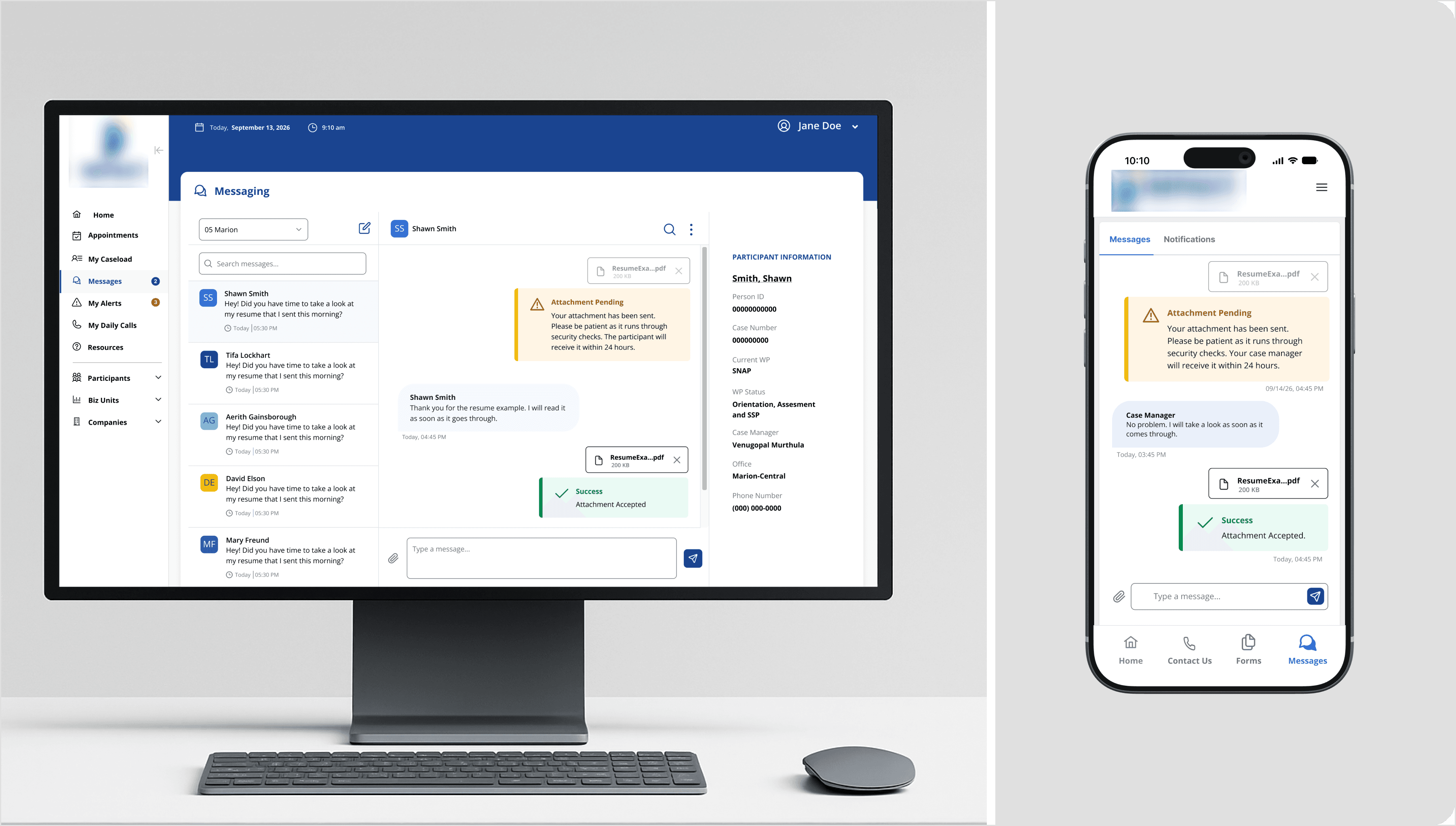 Every attachment sent through the app, whether a resume from a participant or a form from a case manager, has to pass through a security check before it reaches the other person. That process can take up to 24 hours. Left uncommunicated, that gap could easily feel like a failure. A participant who sends their resume and sees nothing happen might resend it, call their case manager, or simply lose confidence in the app. The solution treats the delay as something worth explaining rather than hiding. The moment an attachment is sent, an amber pending message appears in the conversation thread in plain language, telling the user exactly what is happening and how long it could take. When the attachment clears security, a new message arrives in the thread with a green confirmation. No separate notification. No settings screen to check. The status lives inside the conversation where both users are already looking, on both mobile and desktop, in a consistent visual language across both platforms.